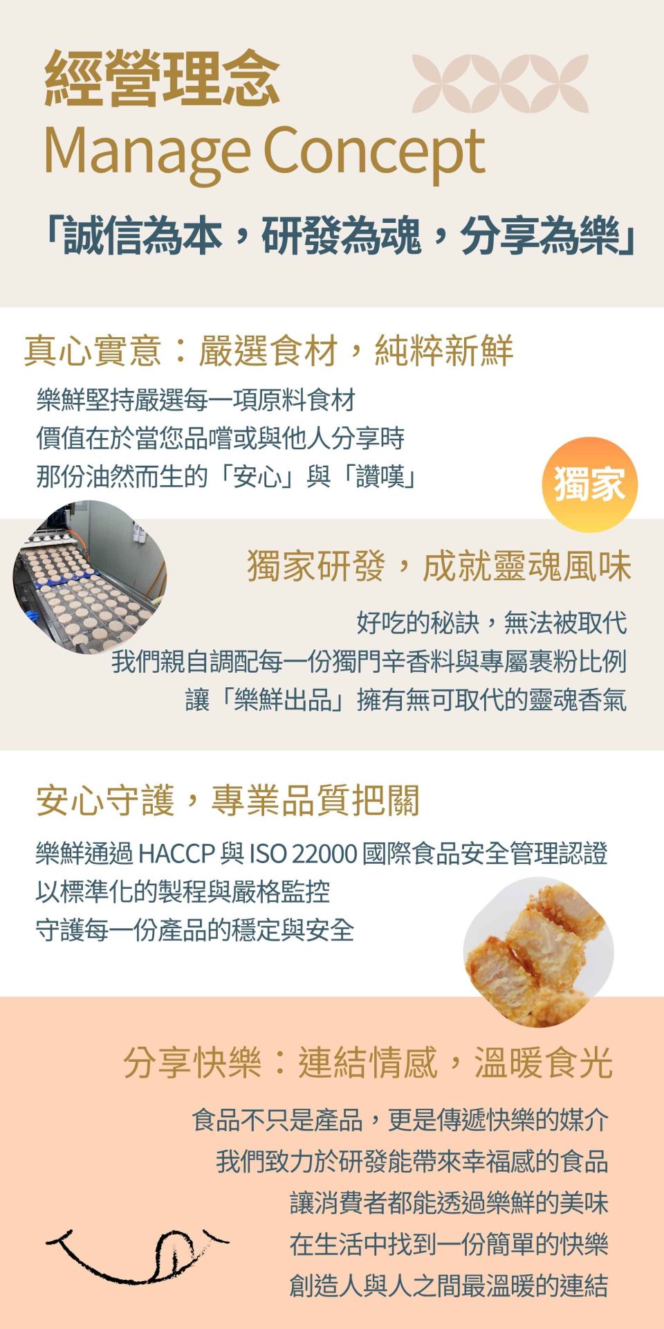 分享快樂,連結生活的每個瞬間無論是親友聚會的歡樂時刻,還是忙碌後想犒賞自己的一餐,樂鮮始終陪伴在您左右。我們不僅生產食品,更致力於創造讓人與人之間產生連結的「快樂食光」。 我們將這份來自台南的誠摯與熱情,濃縮在每一份產品中。 樂鮮企業——讓每一口鮮美,都成為您心中最溫暖的記憶。 |